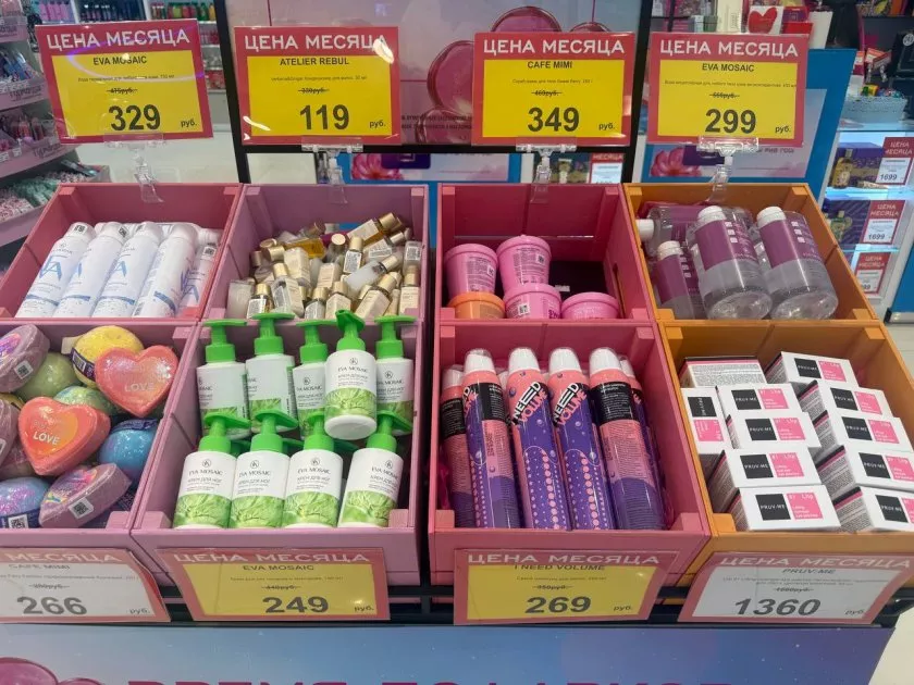 Первое, что бросилось в глаза – это распродажи «Цена месяца». На многие средства были очень приятные цены. Например, вода термальная для любого типа кожи EVA MOSAIC за 329 рублей, а гель для душа ATELIER REBUL всего за 119 рублей! Обычно термальная вода и гель для душа стоят в полтора-два раза дороже. Так что экономия очевидная.
