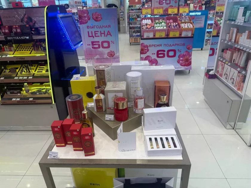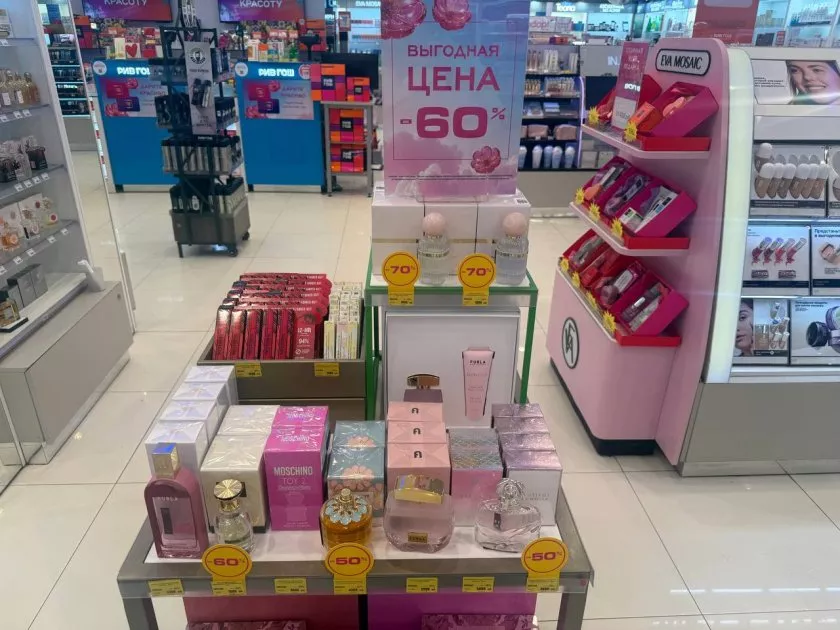 Далее меня потянуло к стеллажам с парфюмерией. «Время подарков» – слоган, который не мог пройти мимо! Скидки до -60% на ароматные наборы – это настоящая находка. Среди представленных композиций выделялись элегантные флаконы с золотистыми и бордовыми акцентами, а также стильные наборы от MORPH с миниатюрами парфюмов.