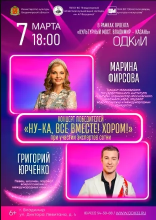 Праздничный концерт - часть программы нового образовательного проекта — «Культурный мост. Владимир-Казань», организованного при поддержке Министерства культуры Владимирской области. В качестве ведущих концерта выступят известные эксперты "сотни" (жюри, оценивавших выступления хоровых коллективов на тв-шоу) - вокалисты, лауреаты всероссийских и международных конкурсов Марина Фирсова и Григорий Юрченко. Начло в 18.00.