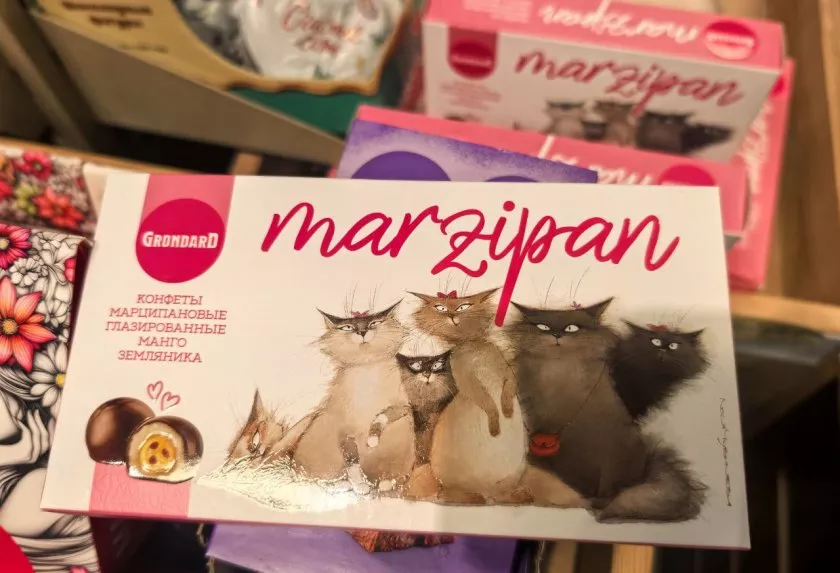 Восторг начался с марципановых глазированных конфет с манго и земляникой. Эти деликатесы – настоящее воплощение тропического рая, где марципан встречается с яркой фруктовой начинкой. Упаковку в 126 граммов можно купить примерно за 315 рублей.