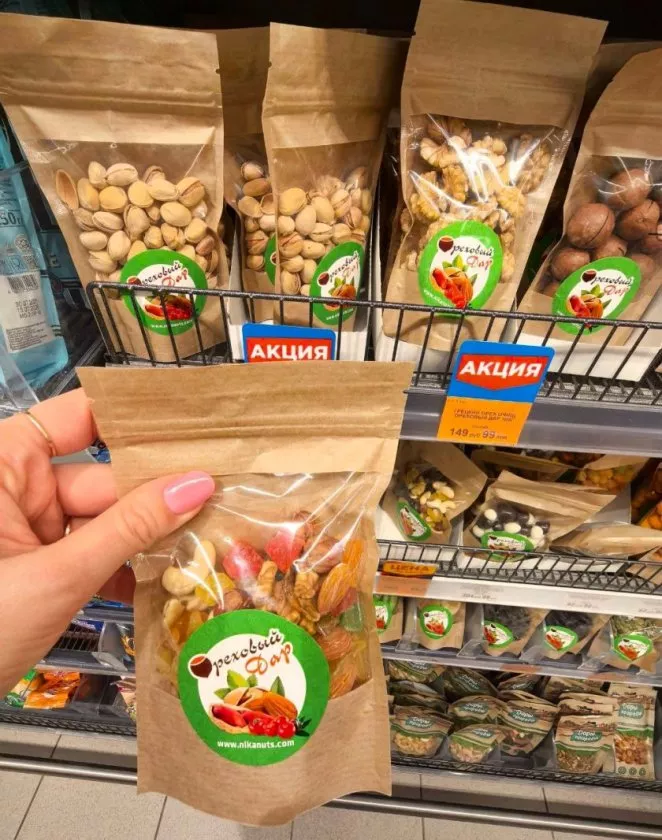 Если не знаете, какие орехи любите больше, или хотите порадовать компанию, присмотритесь к "Ореховому дару". Это такая россыпь всем известных орехов и сухофруктов в одной упаковке: грецкий, миндаль, кешью, цукаты, изюм. Удобно, что можно взять маленькую пачку (100 граммов за 150 рублей) — хватит попробовать, и не придётся потом хранить огромный пакет, если что-то не зайдёт. Я такие беру, когда едем в гости: и недорого, и всегда уместно.