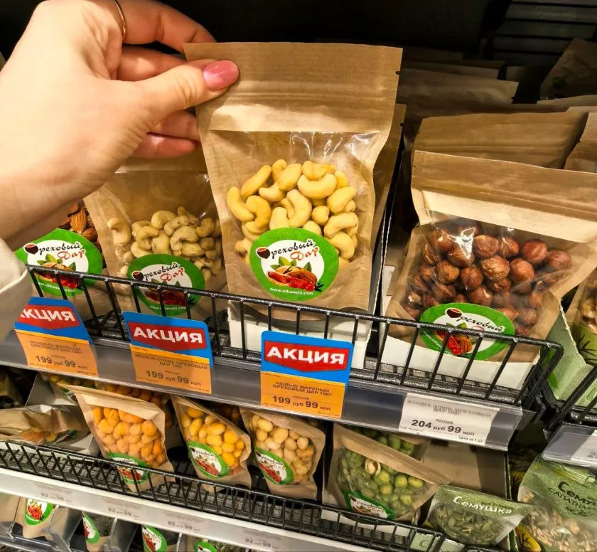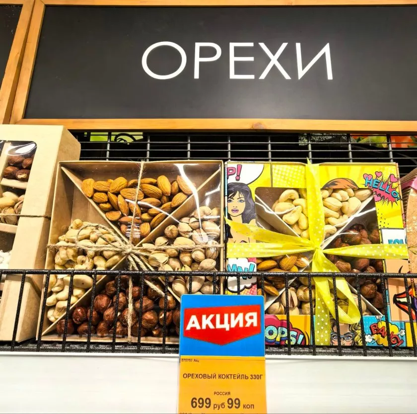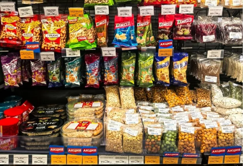 В обычном магазине я привыкла к двум-трём видам арахиса. Здесь же глаза разбежались: больше 30 вариантов! Есть солёный классический, в шоколадной глазури, копчёный, с паприкой, с васаби, в карамели… В общем, хоть каждый день пробуй новый вкус. Я обычно беру сразу несколько пачек и смешиваю дома в миске — получается отличный набор к вечернему сериалу. Цены на арахис вполне демократичные, есть находки по 40-70 рублей за упаковку, если брать простые позиции.