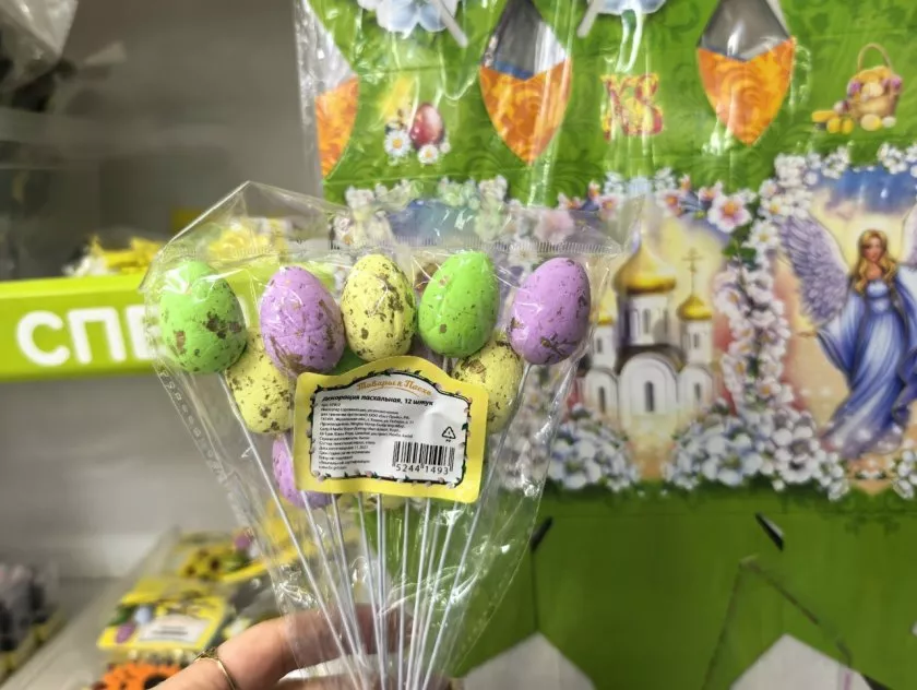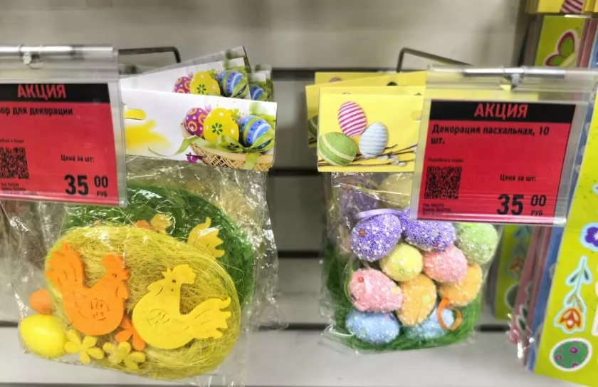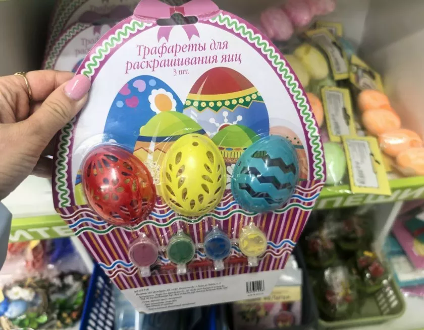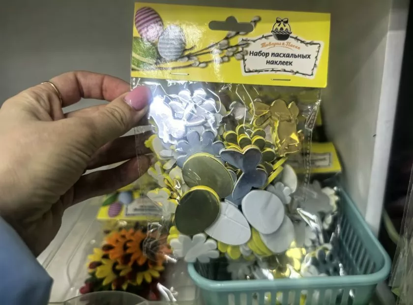 Для тех, у кого дети — там целая полка с наклейками и трафаретами. Наклейки от 27 до 80 рублей: за 80 рублей большой набор, там и цыплята, и яйца, и буквы "ХВ". Можно с ребёнком украсить яйца.