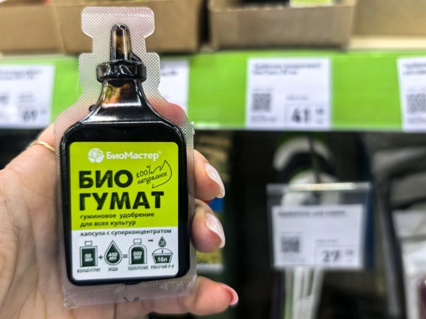 На этикетке написано: «гуминовое удобрение из натурального сырья». На деле оказалась обычная вытяжка биогумуса — то, что червячки переработали, проще говоря. Пахнет специфически: сырой землёй и лесом.
