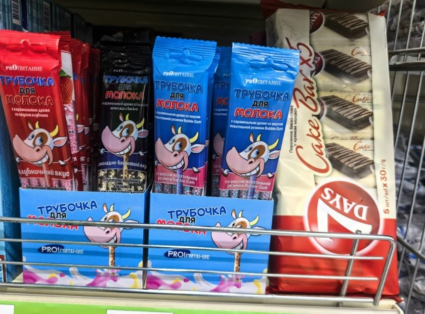 Помните, в детстве было молоко в маленьких пакетиках с трубочкой? Тут почти то же самое, только трубочки продаются отдельно (30 рублей за 5 штук). Есть разные вкусы: внутри каждой трубочки — цветные драже: клубника со сливками, бабл-гам, шоколад с бананом.