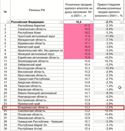 По результатам 2025 года установлено снижение общего уровня потребления алкоголя в стране, при этом тенденции внутри отдельных сегментов оказались разными. Владимирская область оказалась по "злоупотреблению" на 24-м месте. Как видно из рейтинговой таблицы, среднестатистический совершеннолетний владимирец выпивает за год 13,3 л алкоголя или примерно стакан в неделю. За год потребление по региону снизилось на 2,2 процента, но входит в топ-30 регионов такого рейтинга все-таки не очень почётно.