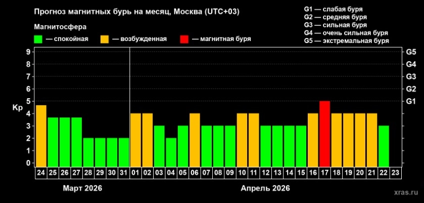 Первые заметные изменения начнутся уже в первых числах апреля. По расчётам учёных, магнитосфера будет неспокойна 1, 2, 6, 10, 11, а затем с 16 по 21 число — всего 11 дней с возмущениями до 4 баллов. Отдельно выделяется 17 апреля, когда ожидается слабая магнитная буря уровня G1. В общей сложности около трети месяца окажутся нестабильными, а пик придётся на вторую декаду.