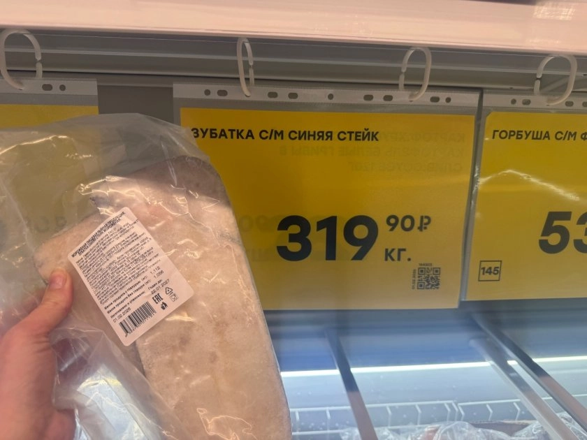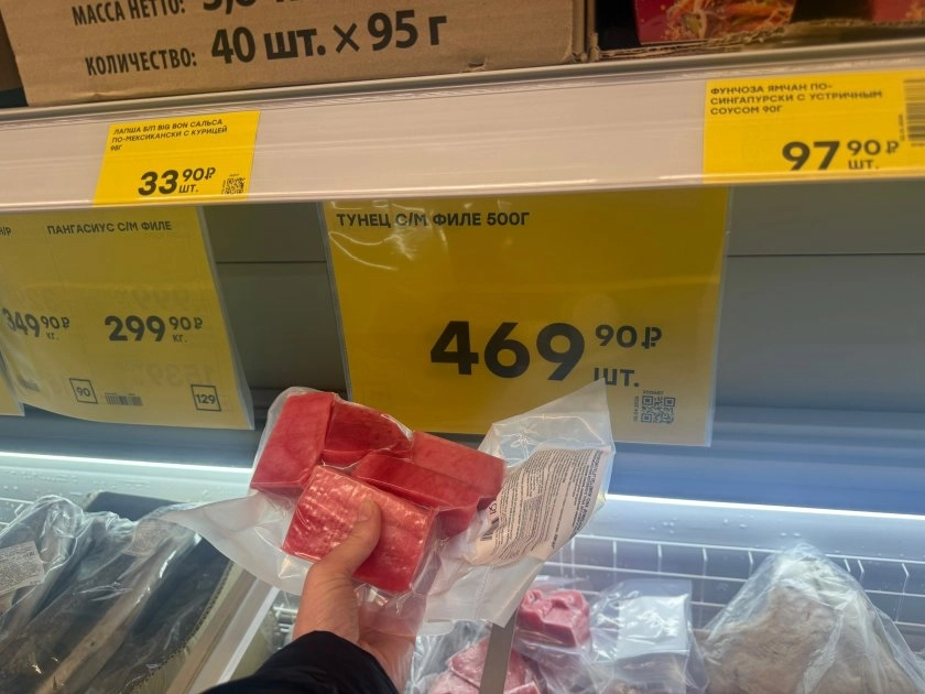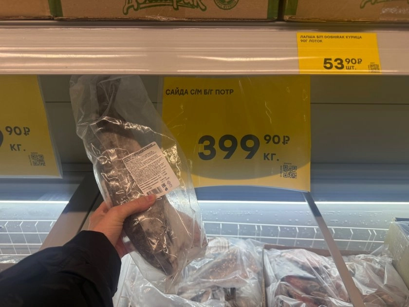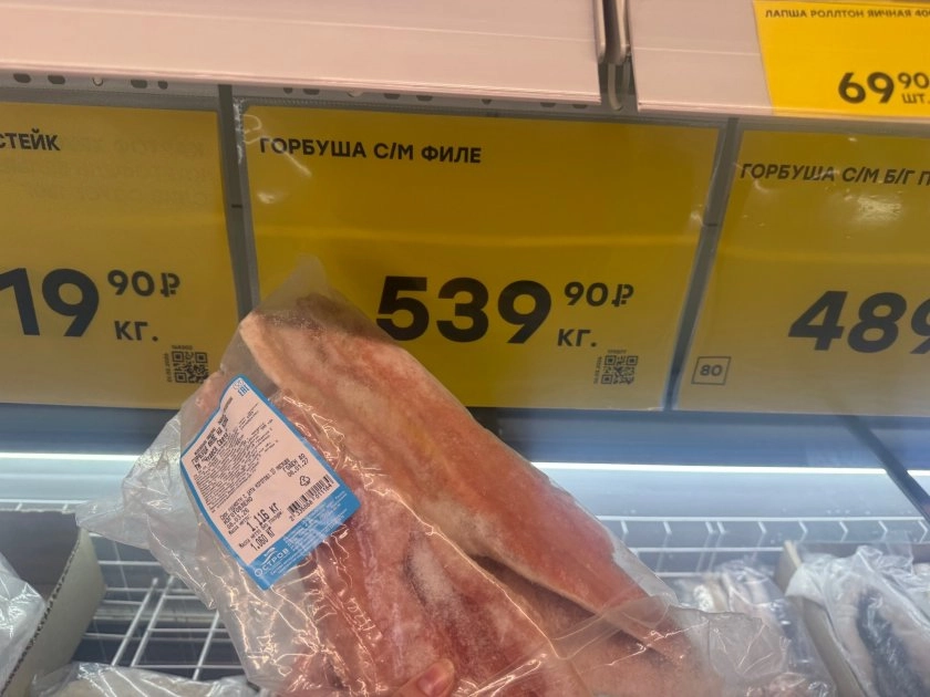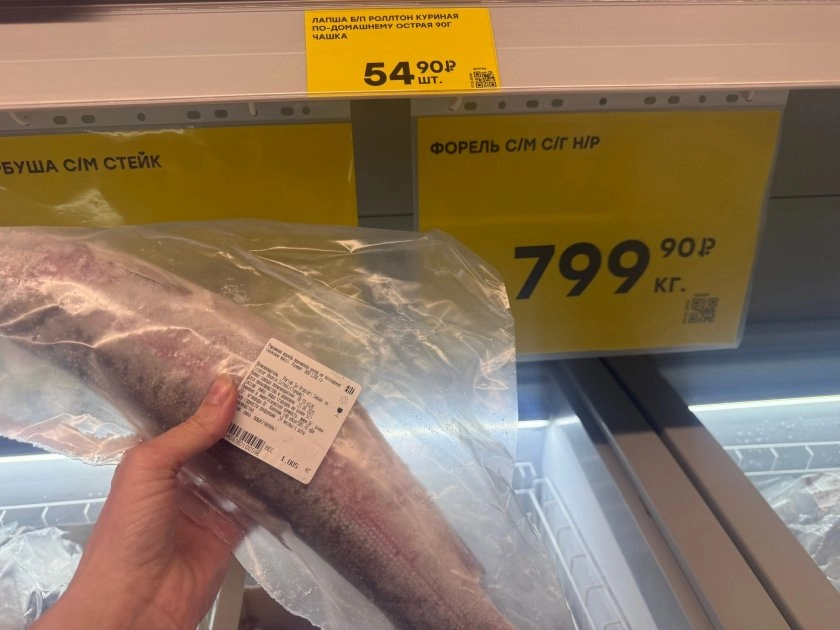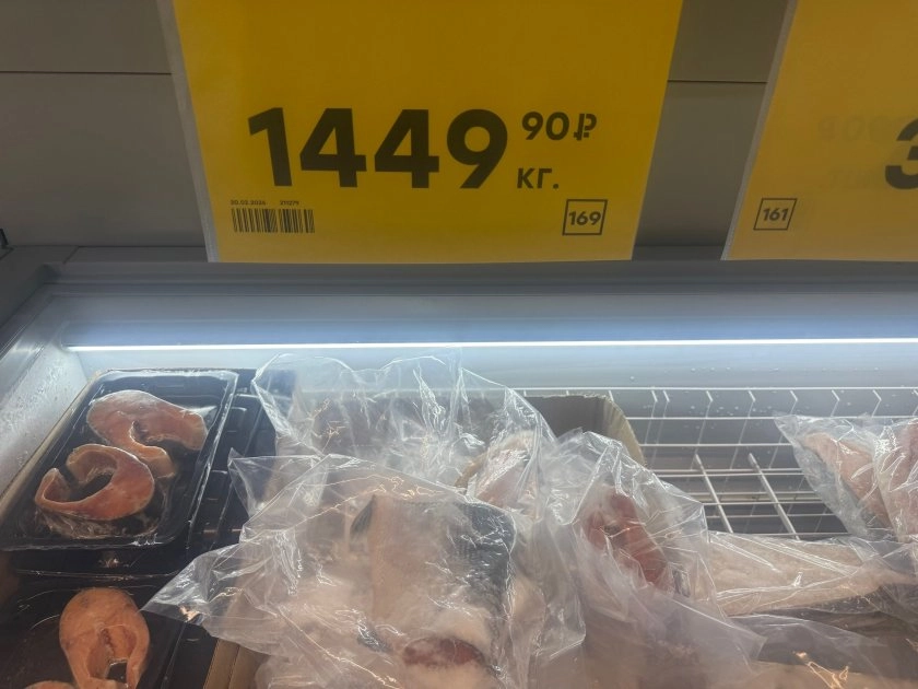 Я редко захожу в «Победу». Но в прошлый раз проходила мимо и завернула в рыбный отдел — просто посмотреть. Заморозка была забита под завязку. Стеклянные витрины, горы упаковок, ценники. Я постояла, почитала. И вот что там лежало.