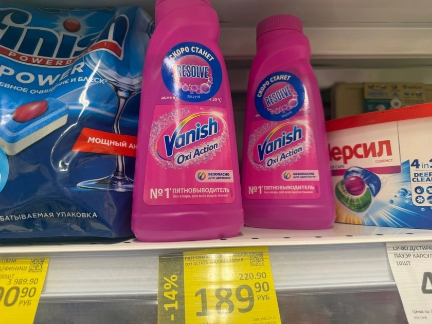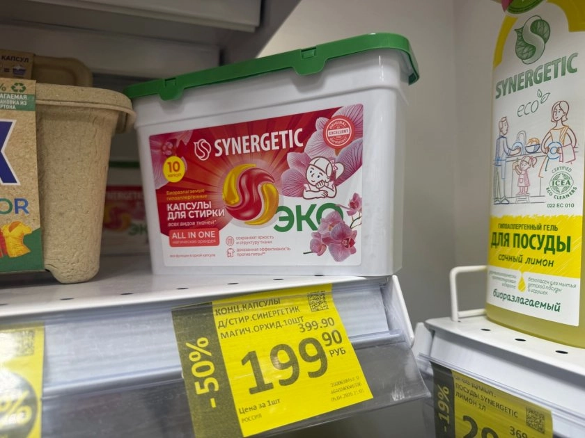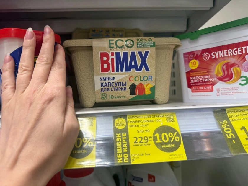 Тут схема запутанная. На ценнике указано две цены. Если у вас есть карта магазина и вы участвуете в программе кэшбека, то капсулы обойдутся в 549,90 рубля. Звучит дорого. Но если карты нет, то цена — 229,90 рубля. Разница огромная. Видимо, скидка для держателей карт не действует, а кэшбек начисляется потом. Капсулы подходят для цветного белья и обещают сохранять яркость тканей. Упаковка яркая, всё по-честному.