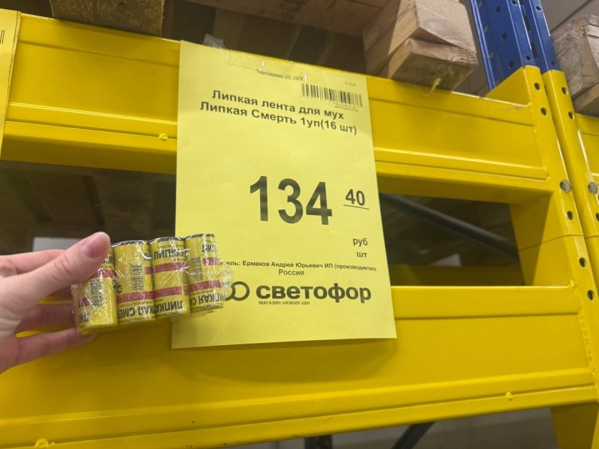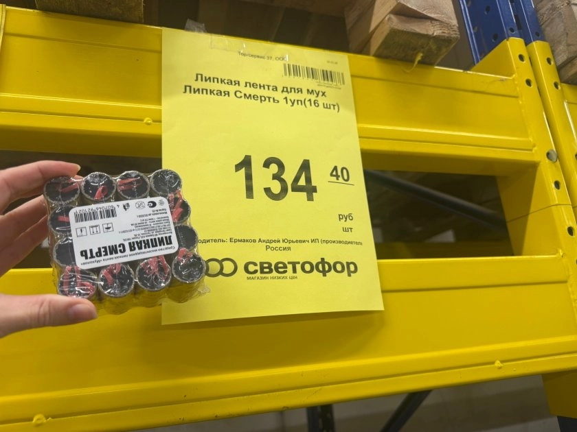 Обычная лента, каких много. Жёлтая, клейкая, сворачивается в трубочку. В упаковке — 16 штук. Производитель обещает, что мухи и другие летучие гады будут прилипать и не вырвутся. Я подумала: на даче, в беседке или на кухне, где мухи роем, такое количество хватит на всё лето. Цена 134 рубля — выходит по 8 с копейками за штуку.