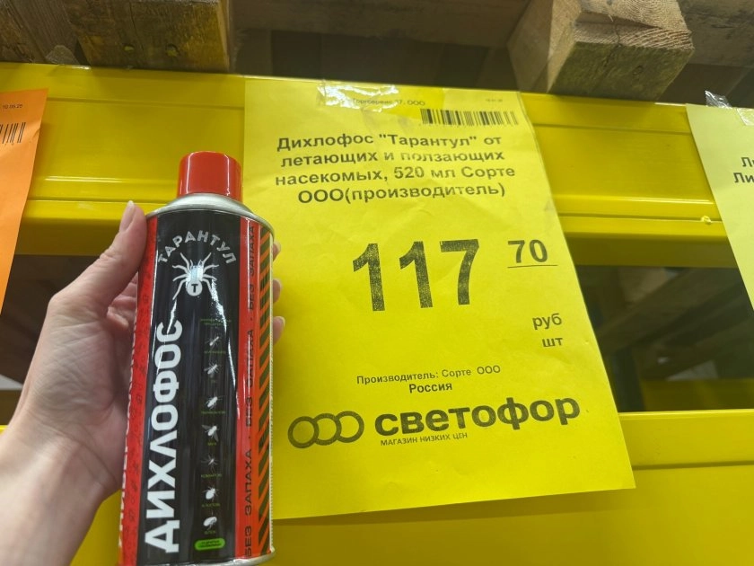 Огромный баллон. 520 миллилитров — это почти поллитра яда. На этикетке перечислены: муравьи, осы, мухи, комары, тараканы, клопы, блохи и другие насекомые. Настоящий «Тарантул». Я подумала: на даче это может пригодиться, если завелись муравейник или осы под крышей. Но дихлофос — штука серьёзная, пахнет сильно, дышать им в помещении нельзя.