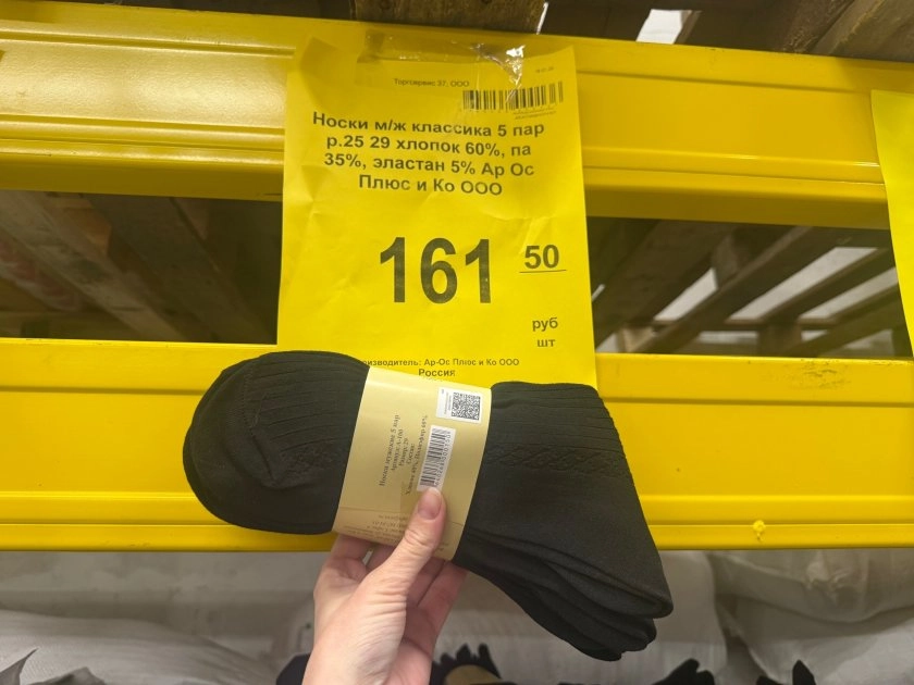 Пять пар в одной связке. Размеры 25–29 — это примерно с 39-го по 45-й. Состав — хлопок и полиэфир, то есть тянутся будут, но могут и электризоваться. На вид плотные, не просвечивают. Цена 161 рубль за пять пар — выходит 32 рубля за пару.