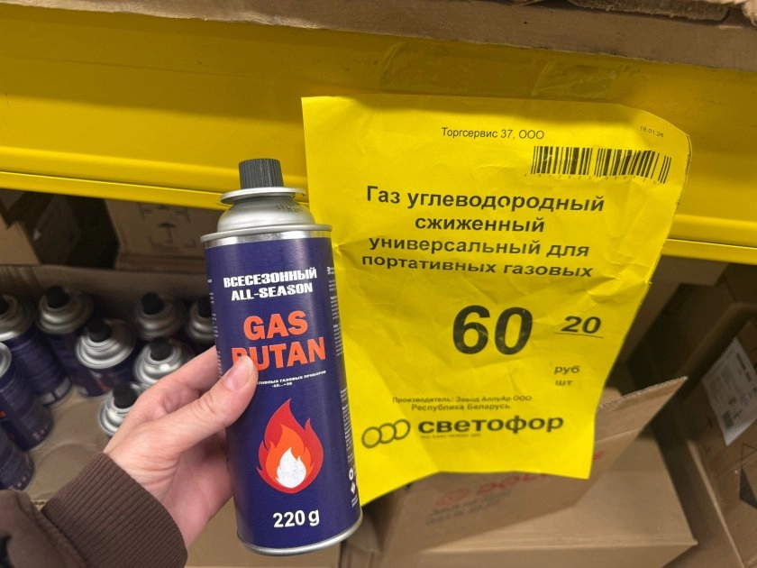 Баллончик стандартный, для туристических плиток и горелок. Вес 220 граммов. Цена 60 рублей. Для дачи, для похода, для шашлыков — можно брать пачкой. Главное — чтобы срок годности не истёк.