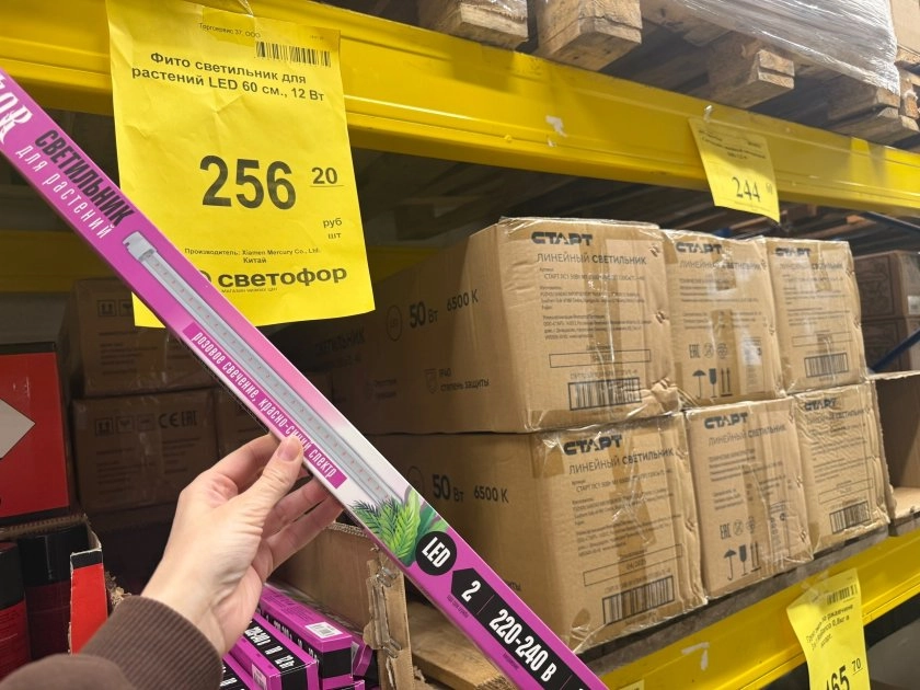 Длинная лампа, 60 сантиметров. Светодиодная, 12 Вт. Производитель обещает 2 года службы. Для рассады на подоконнике — в самый раз.