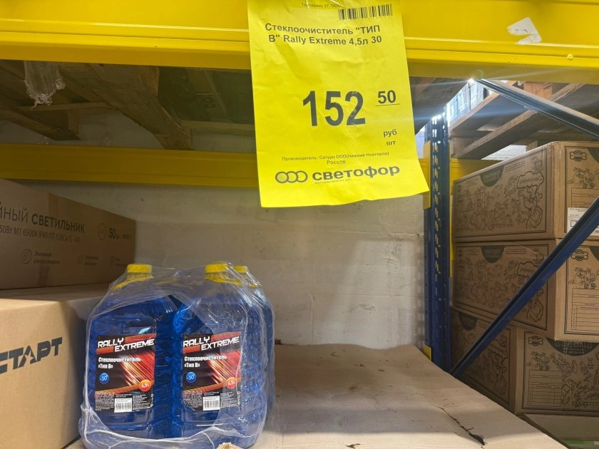 Бутыль огромная, 4,5 литра. Стеклоочиститель «Тип В» — значит, замерзает при -20 (вроде бы). Цена 152 рубля — это 34 рубля за литр. Экономия бешеная.