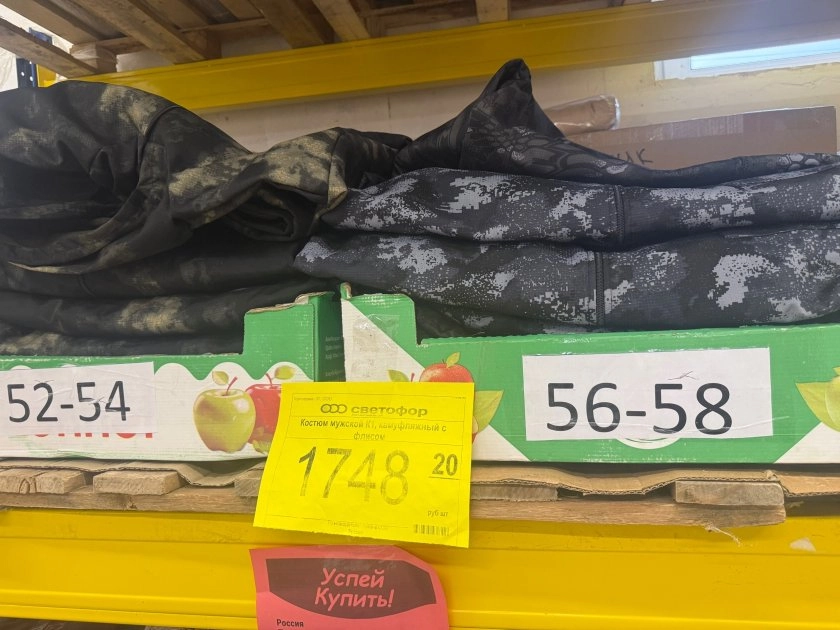 Камуфляж, с флисом внутри — значит, тёплый. Для охоты, для рыбалки, для работы на улице. Размеры крупные — 52–58. Комплект стоит 1748,20 рубля.