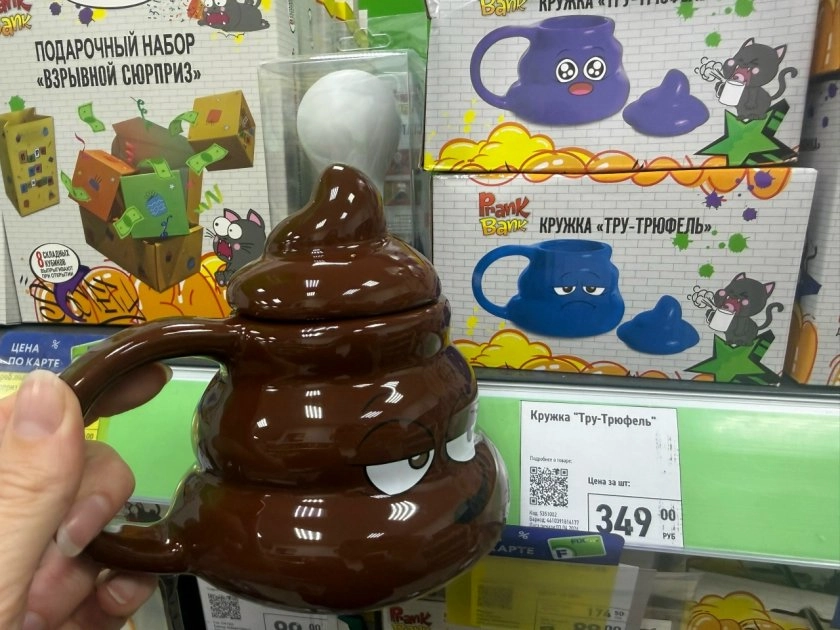 Кружка-приколюжка в виде мусорного ведра (299 руб.). Крышка открывается. Наливаешь чай, и будто из помойки пьёшь. Звучит ужасно, выглядит забавно.