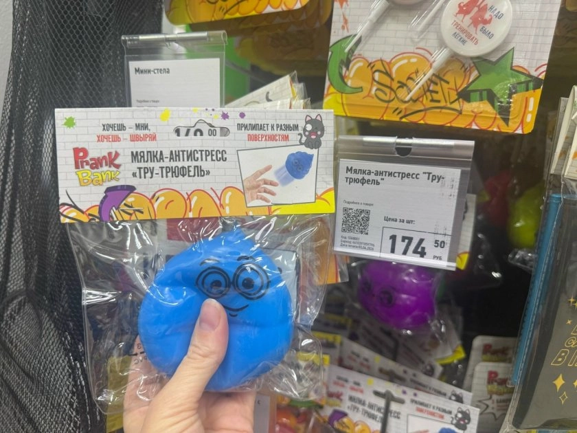 Мялка-антистресс "Тру-Трюфель" (174 руб.). Синяя или фиолетовая. Чтобы мять в руках, когда всё напрягает. Производитель отмечает, что она может прилипать и к стенам, и к потолку.