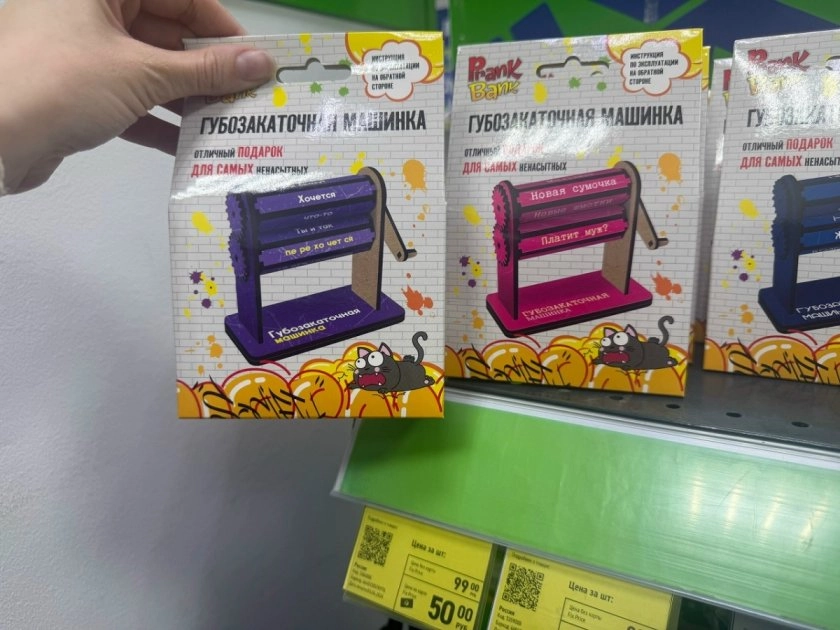 Губозакаточная машинка (99 руб. / 50 руб. по карте). Синяя, фиолетовая, розовая. С надписями вроде "Перехочется" или "Платит муж?". Механизм прост: крутишь ручку — губа закатывается обратно. Вещь абсолютно бесполезная, но забавная.