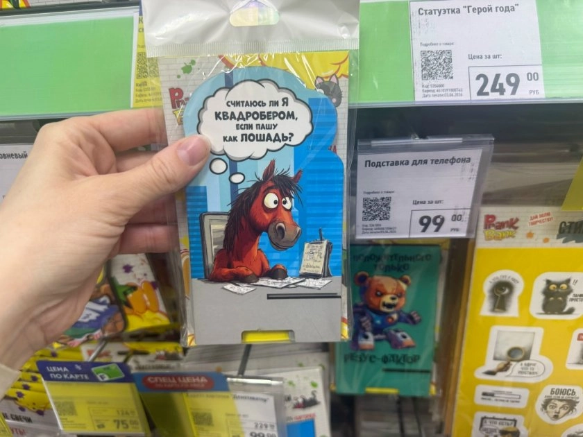 Подставка для телефона за 99 рублей. На картинке лошадь за ноутбуком и надпись: «Считаюсь ли я квадробером, если пашу, как лошадь». Действительно смешно.