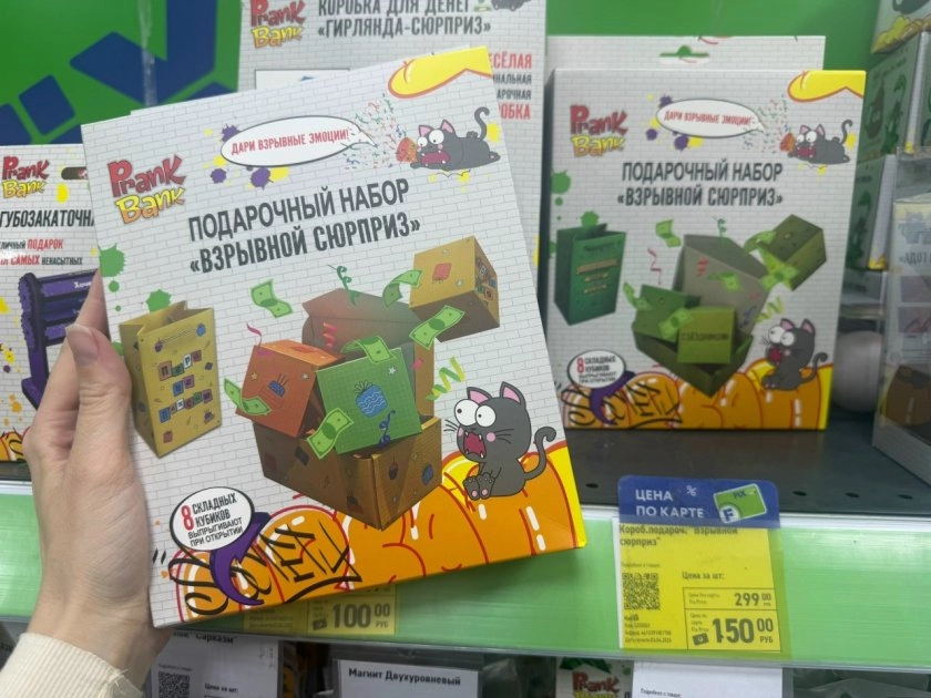 Подарочный набор "Взрывной сюрприз" (299 руб. / 150 руб. по карте). Выглядит как обычный пакет с подарком. Открываешь — выпрыгивают складные кубики. Старая добрая шутка для розыгрыша.