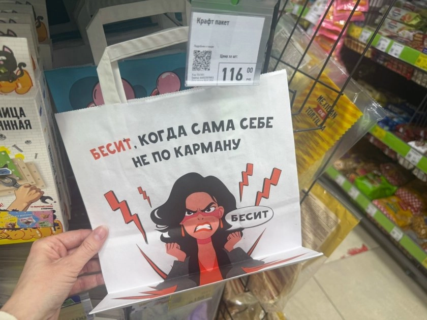 Крафтовый пакет с надписью "Бесит, когда сама по себе не по карману". Ирония в том, что сам пакет стоит 116 рублей. Зато честно.