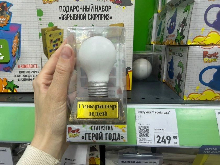 Статуэтка "Герой года" в виде лампочки (249 руб.). Светит или нет — непонятно, но выглядит как Оскар из мира ЖКХ.