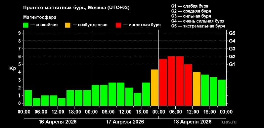 - 18 апреля, суббота. Пик. К полудню показатели поднимутся до 6 баллов. Это уже классическая средняя магнитная буря. Заметят даже те, кто обычно считает себя нечувствительным к таким вещам.
