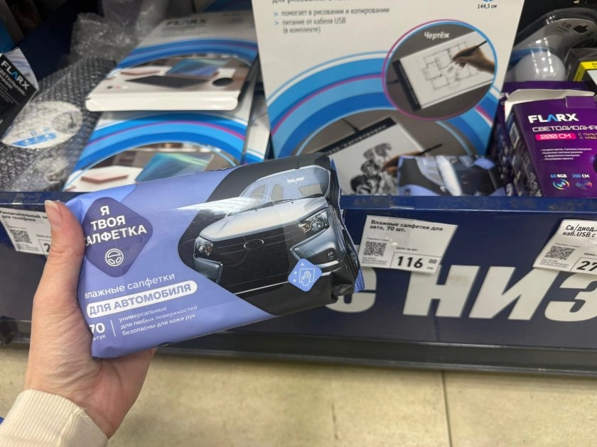 Первое, что увидела — влажные салфетки для авто. Здоровая пачка, 70 штук и всего за 116 рублей. Написано, что годятся для любых поверхностей и безопасны для кожи рук. Выглядят внушительно.