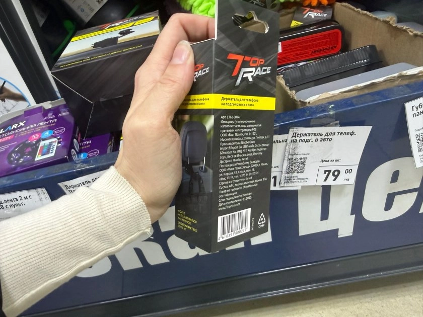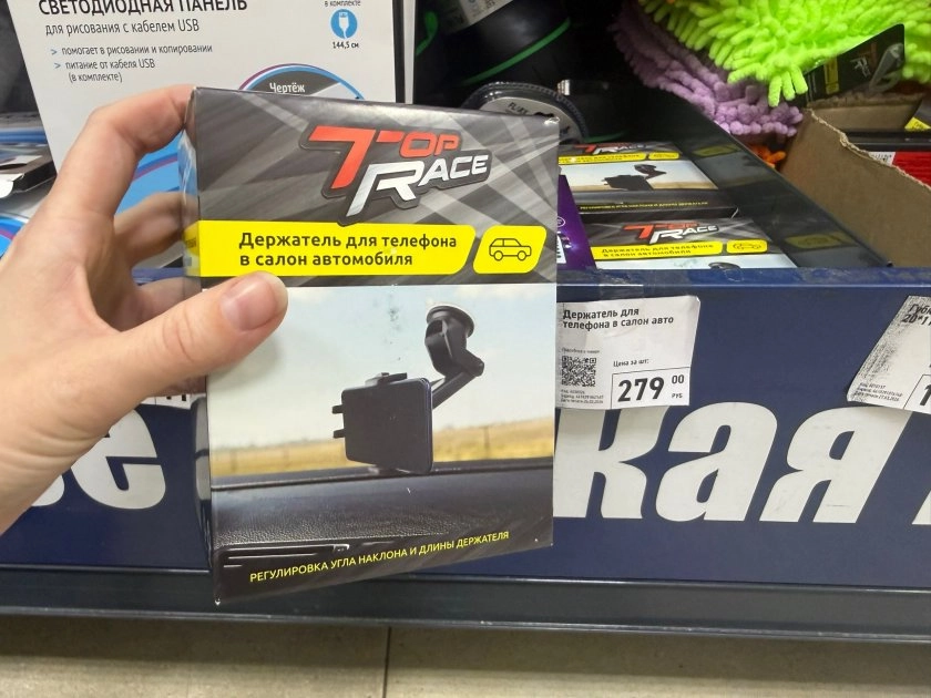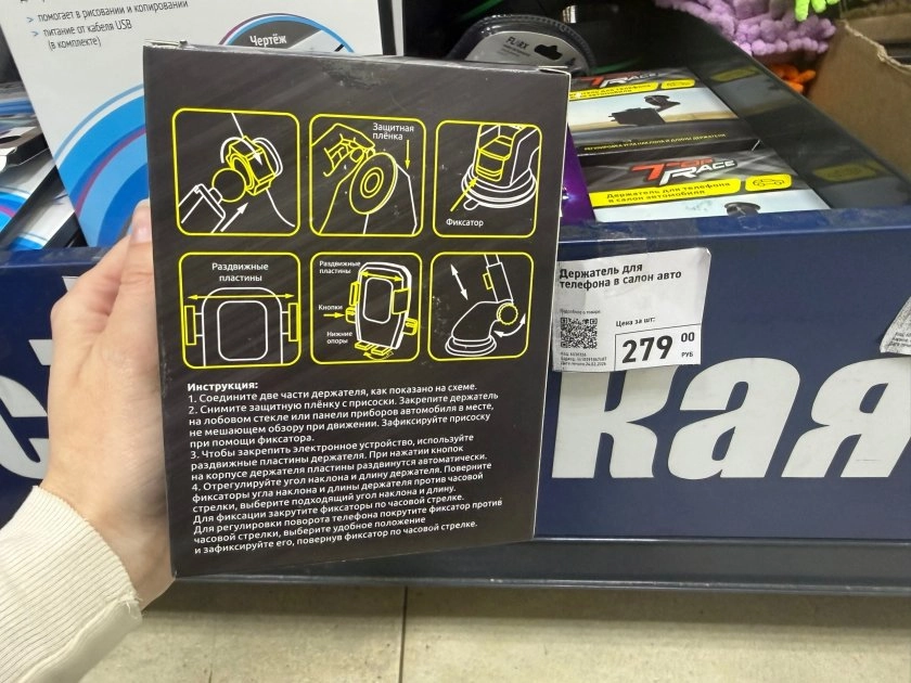 На полке увидела 2 варианта. Первый — классический держатель в салон за 279 рублей. Можно изменить угол наклона и регулировать длину, а на упаковке есть подробная инструкция по установке. Выглядит стандартно, ничего сверхъестественного.