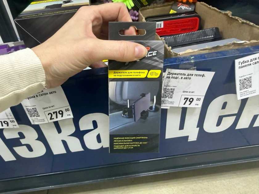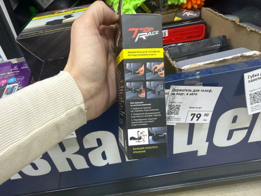 Второй экземпляр поинтереснее — держатель на подголовник за 79 рублей. Производитель обещает, что прибор выдерживает до 10 кг. Можно телефон пассажирам повесить, чтобы кино смотрели, а можно пакет с продуктами.