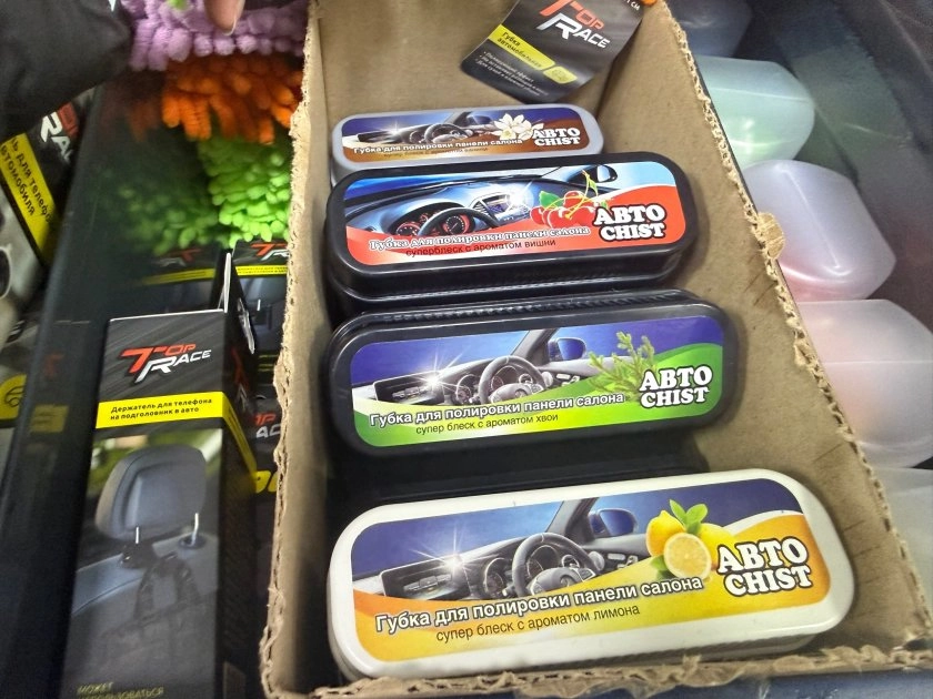 И совсем уж копеечная радость — губка для полировки панели, 49,50 рубля. Вот тут я зависла, потому что есть разные ароматы на выбор: лимон, хвоя, вишня, ваниль. Представляете? Протер панель губкой с вишней — и в салоне пахнет, как в кондитерской.