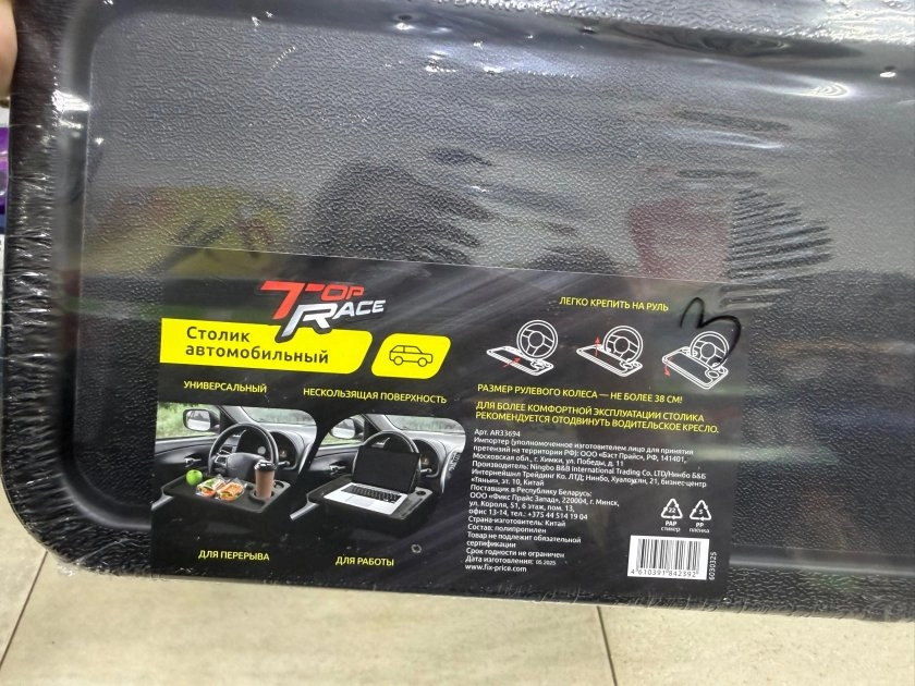 Автомобильный столик за 279 рублей крепится на руль, если его диаметр не больше 38 см. Поверхность нескользящая. На упаковке указано, что можно обедать или ноутбук поставить и работать.
