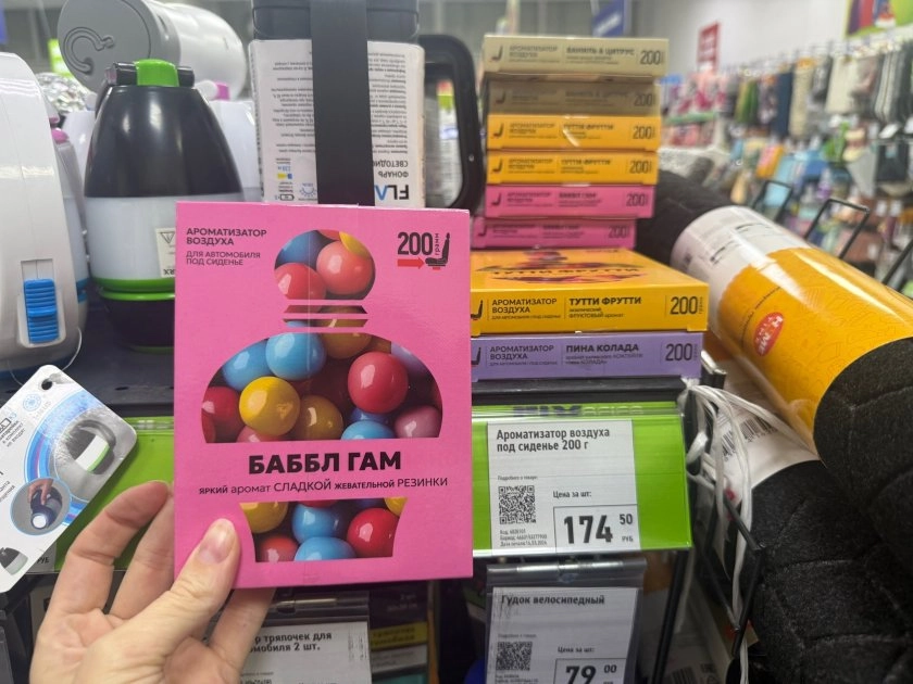 И последний штрих — ароматизатор под сиденье, 174,50 рубля. Здоровая банка на 200 граммов. Ароматы на выбор: сладкая жвачка Баббл Гам, ваниль с цитрусом, Тутти Фрутти и Пина Колада.