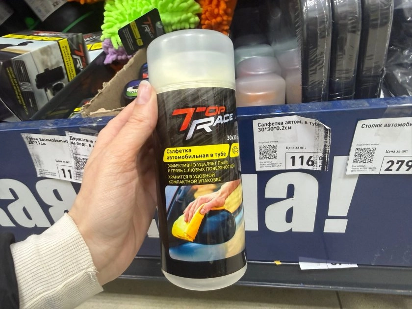 Рядом лежит автомобильная салфетка в тубе, тоже 116 рублей. Размер — 30 на 30 см, толщина два миллиметра. Производитель обещает, что салфетка собирает пыль и грязь отовсюду. И главное — ее можно постирать: мягким средством и без отбеливателей и кондиционеров. Свернул в тубу, кинул в карман двери — и пусть лежит до лучших времен.