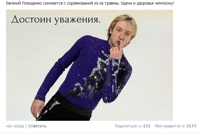 Уходящий олимпийский день, возможно, станет самым противоречивым для российской сборной. Огорчил Евгений Плющенко, который буквально за несколько минут до начала выступления с короткой программой снялся с соревнований. Дали о себе знать серьезные проблемы со спиной. В социальных сетях уже появились демотиваторы об этом печальном событии. Болельщики Плющенко оправдали.