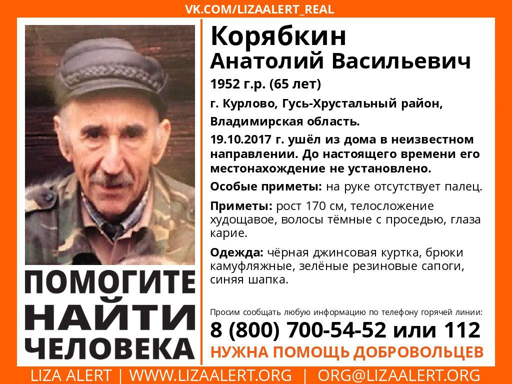В городе Курлово Гусь-Хрустально района Владимирской области уже неделю разыскивают бесследно пропавшего пенсионера. 19 октября 2017 года 65-летний Корябкин Анатолий Васильевич вышел из дома и больше не вернулся.