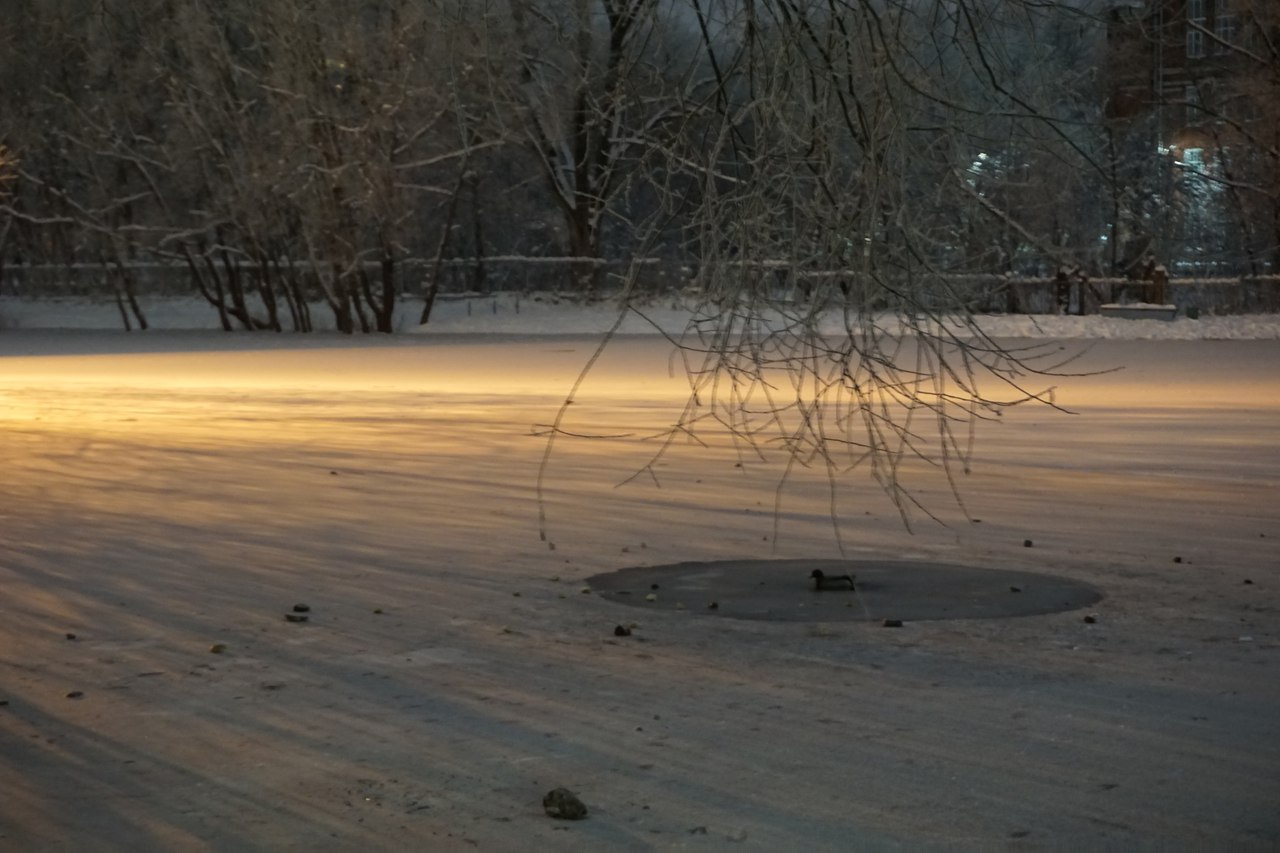 - Остался он один на замершем пруду и не может или не хочет улететь. Есть предположение, что птица просто отъелась и не может взлететь, - поясняет Евгений. - Местные жители пытались его поймать с помощью сачка, так как переживает,а то его может сковать лед.