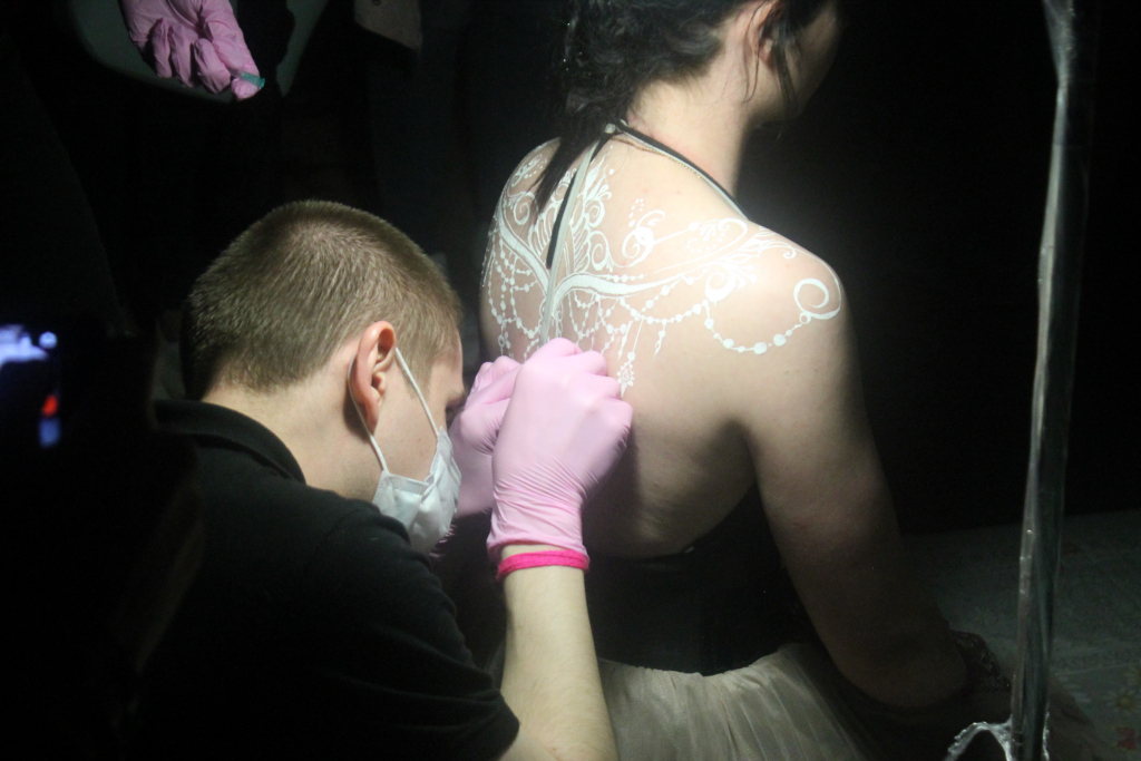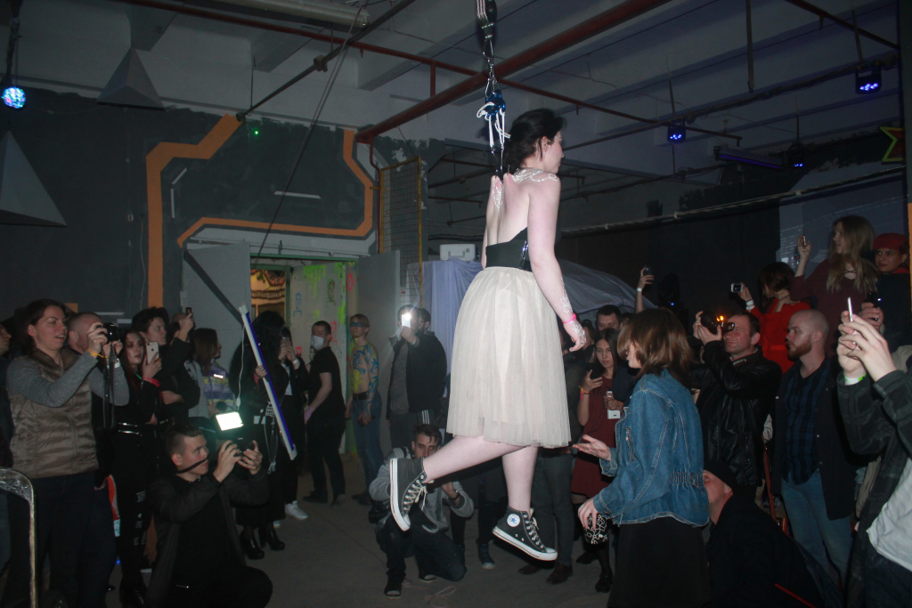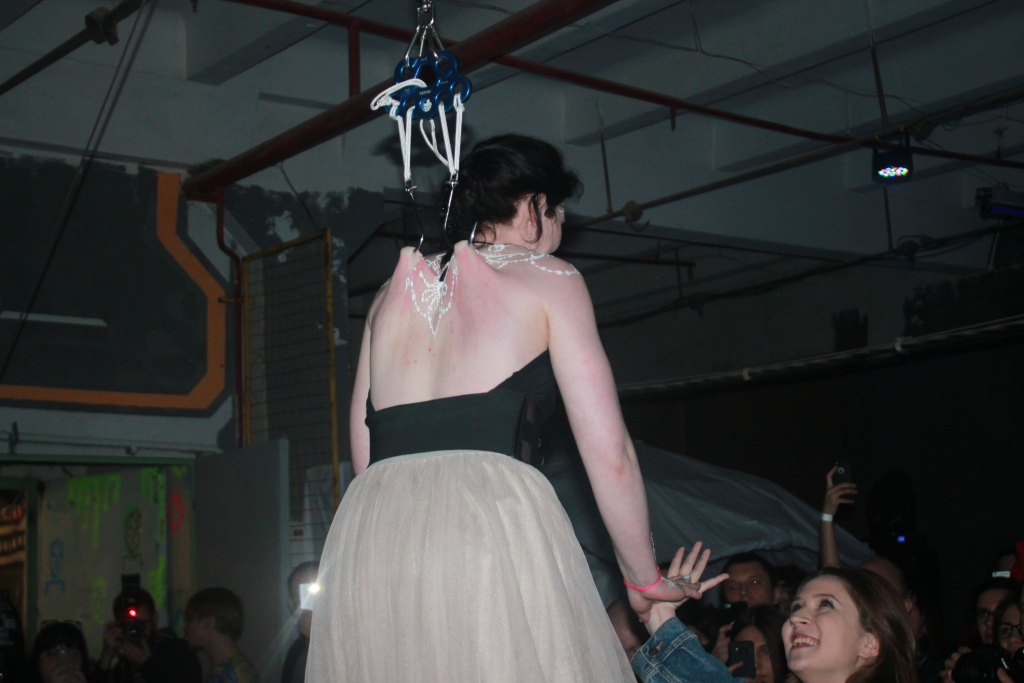 Помимо выставок и лекций, участники и организаторы приготовили массу различных перфомансов. Один из самых ярких - подвешивание. Участникам протыкают кожу специальными крюками, после чего поднимают их вверх, где они висят только лишь на собственной коже. Эта практика давно распространена во всем мире, и ее любители находят в этом особенный интерес и удовольствие.