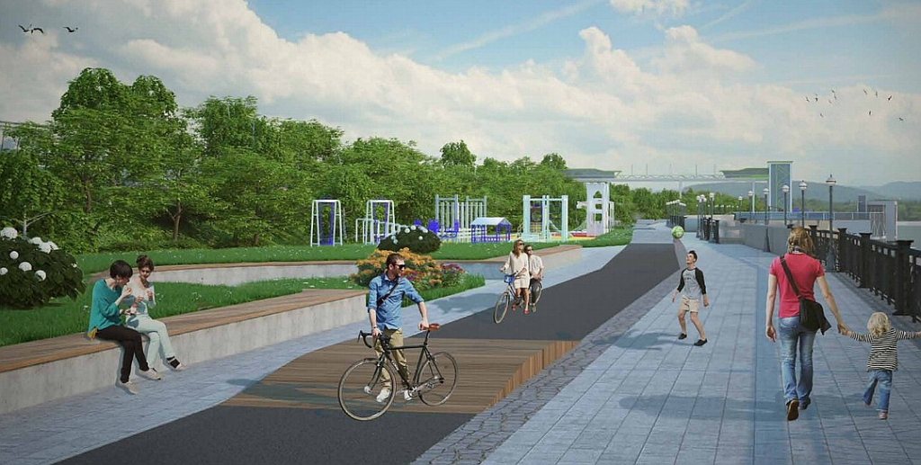 От центра города предусмтрены два спуска к набережной. На протяжении всей набережной будут расположены смотровые площадки, пляжи, спортивные зоны и прогулочные аллеи. Рядом будет проложены велосипедные дорожки.
