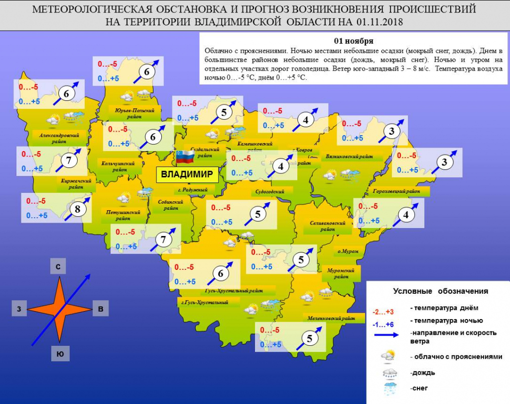 По данным Владимирского центра по гидрометеорологии и мониторингу окружающей среды, завтра горожан ждет облачно с прояснениями. Ночью местами небольшие осадки (мокрый снег, дождь). Днем в большинстве районов небольшие осадки (дождь, мокрый снег). Ночью и утром на отдельных участках дорог гололедица.