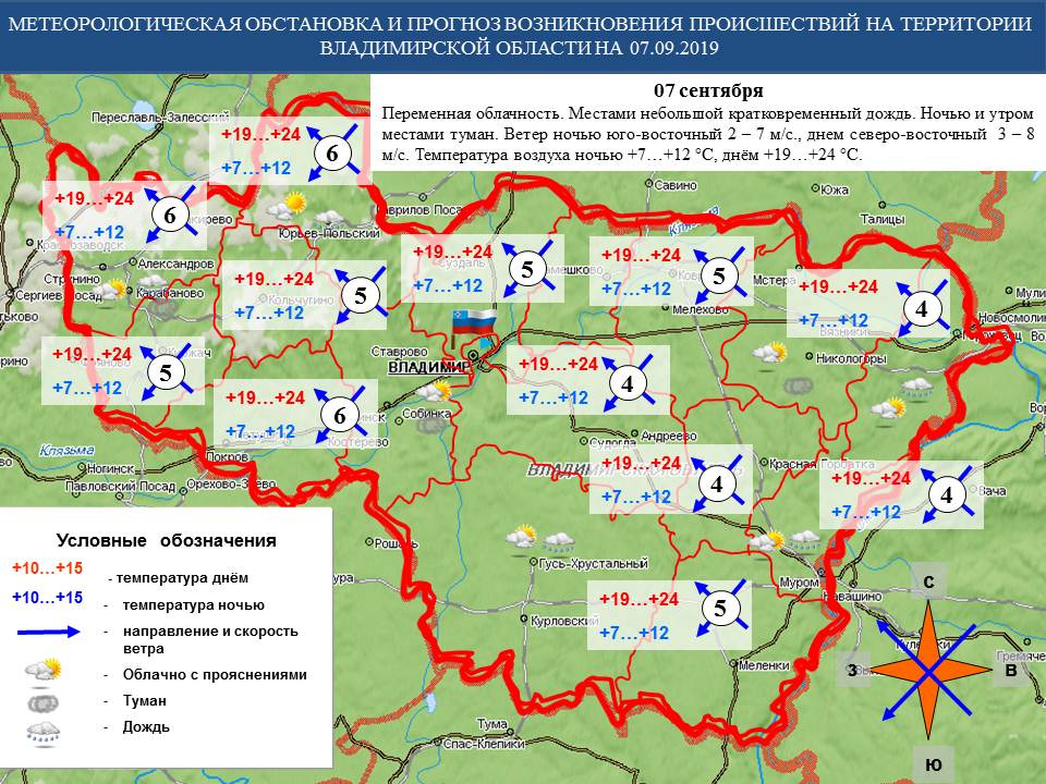 По данным владимирского центра по гидрометеорологии и мониторингу окружающей среды 7 сентября во Владимире и области - переменная облачность. Местами небольшой кратковременный дождь. Ночью и утром местами туман. Ветер ночью юго-восточный 2 – 7 м/с., днем северо-восточный 3 – 8 м/с. Температура воздуха ночью +7…+12 °C, днем +19…+24 °C.