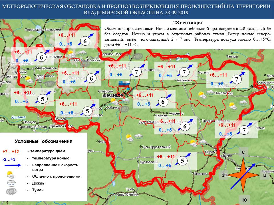 28 сентября во Владимире будет облачно с прояснениями. Ночью местами пройдет небольшой кратковременный дождь. Днём осадков не ожидается. Ночью и утром в отдельных районах будет тумано. Ветер ночью северо-западный, днём юго-западный 2 - 7 м/с.