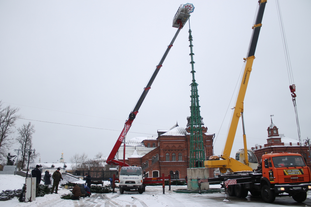 На Соборной площади устанавливают каркас и нарядную верхушку. А в скором времени новогодняя красавица обзаведётся хвоей. Фото Кирилла Калягина.