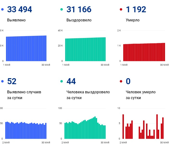 Также за прошедшие сутки смертей от коронавируса не было зафиксировано (всего 1192 летальных случаев), выздоровели 44 человека (всего 31 166).