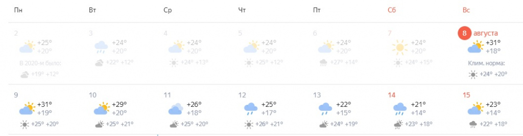 В понедельник и вторник будет жарко: температура воздуха составит около 30 градусов Цельсия; в среду и четверг столбик термометра опустится до отметки +25...+26 градусов, а к концу недели - до +22 градусов. Кроме того, в четверг, пятницу и субботу ожидаются дожди.