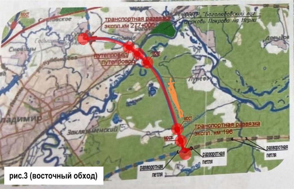 Вариант 3 – «Восточный обход». Равноудален от основных транспортных потоков со стороны Москвы, Нижнего Новгорода и Мурома. Значительно облегчает осуществление проекта отсутствие пересечений с М-12 и ВСМ-2, и соответственно исчезает необходимость строительства путепроводов через них. Восточный обход сможет избавить владимирских автолюбителей от затяжных заторов в районе Загородного, в частности на Судогодском шоссе, за счет сооружения второго моста через Клязьму.