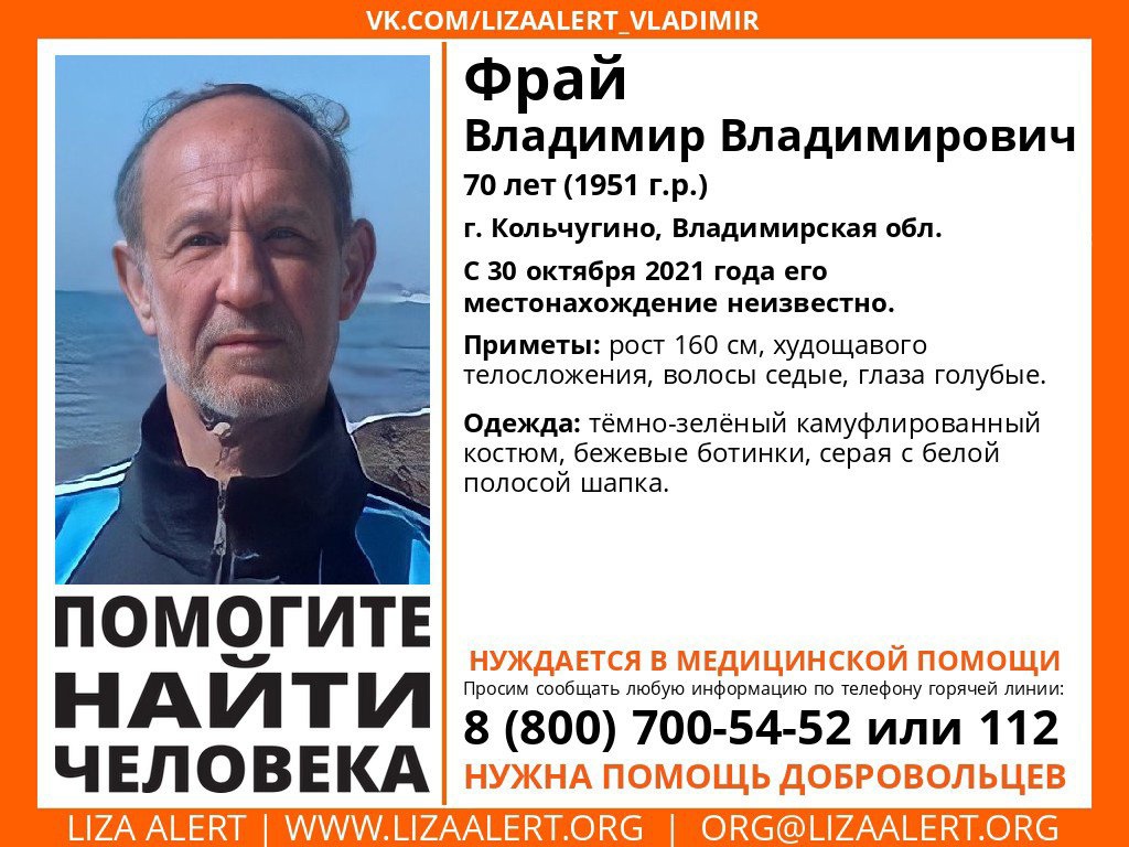 Пропал Фрай Владимир Владимирович 1951 г.р. (69 лет), г. Кольчугино, Владимирская обл.