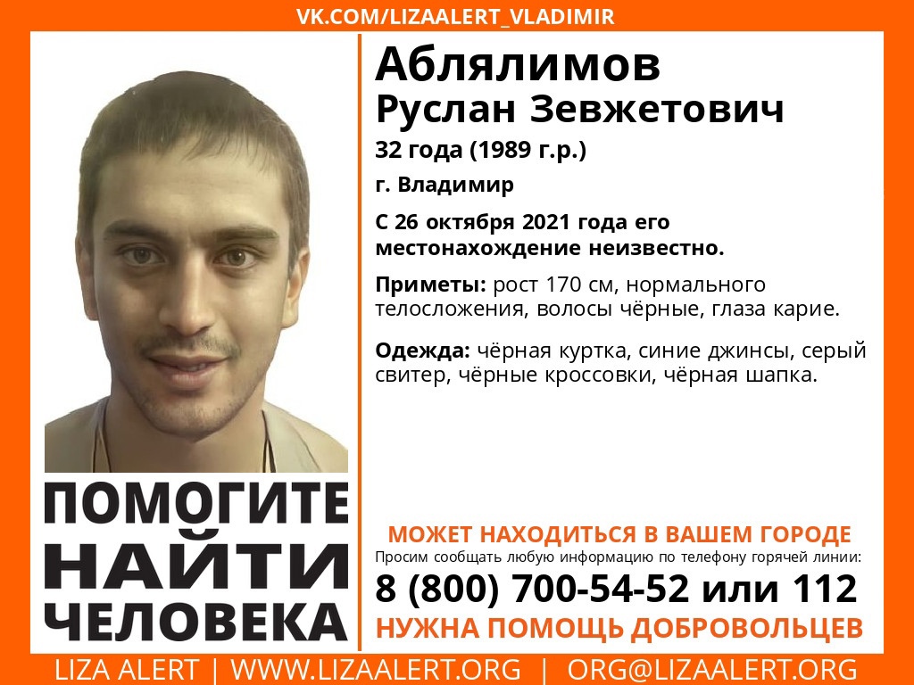 Пропал Аблялимов Руслан Зевжетович 1989 г.р. (32 года), г. Владимир.
