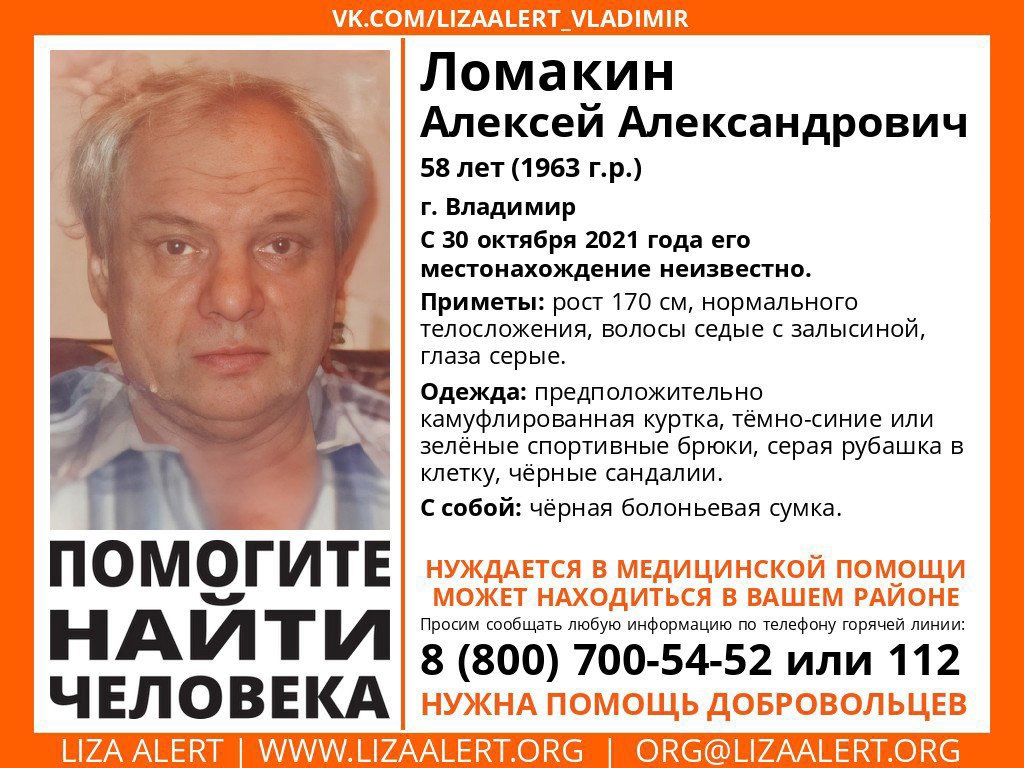 Пропал Ломакин Алексей Александрович 1963 г.р. (58 лет), г. Владимир.